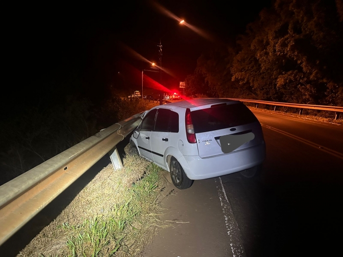 Os bombeiros foram acionados às 23h30 deste domingo (13) no km 57,200 da rodovia SC-480, em Ipuaçu, depois que um veículo Ford Fiesta com placas de Barracão (RS) bateu contra a grade de proteção da via.